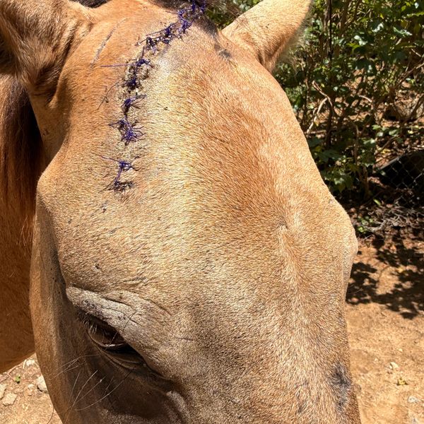 Franky (named after Frankenstein), is our newest horse. He came to us thin and likely full of worms. He is still gaining weight and strength before he will join us on trail rides. Franky cut open his face on his first days at the farm, requiring stitches, but luckily he is healing and starting to get healthy!